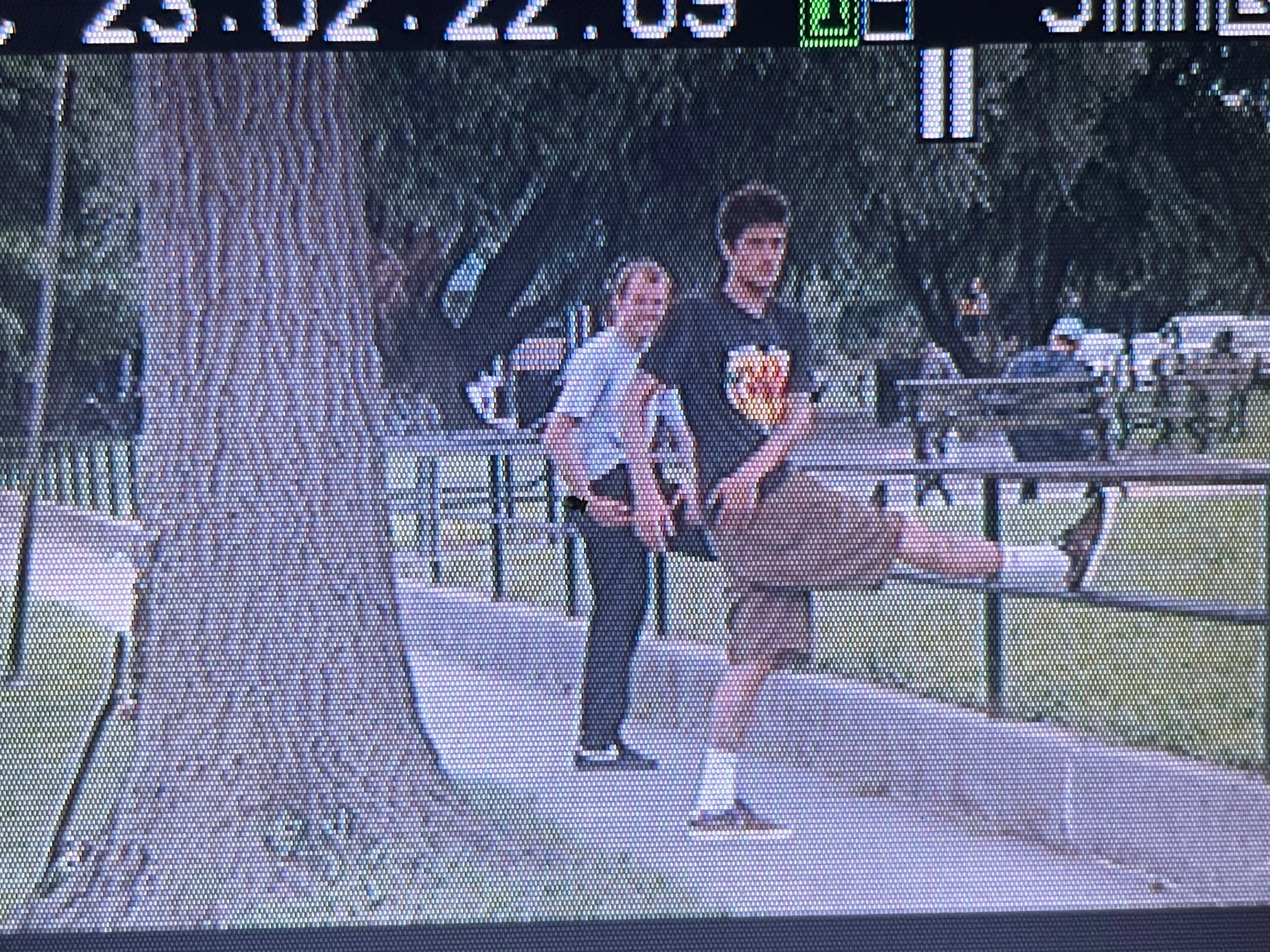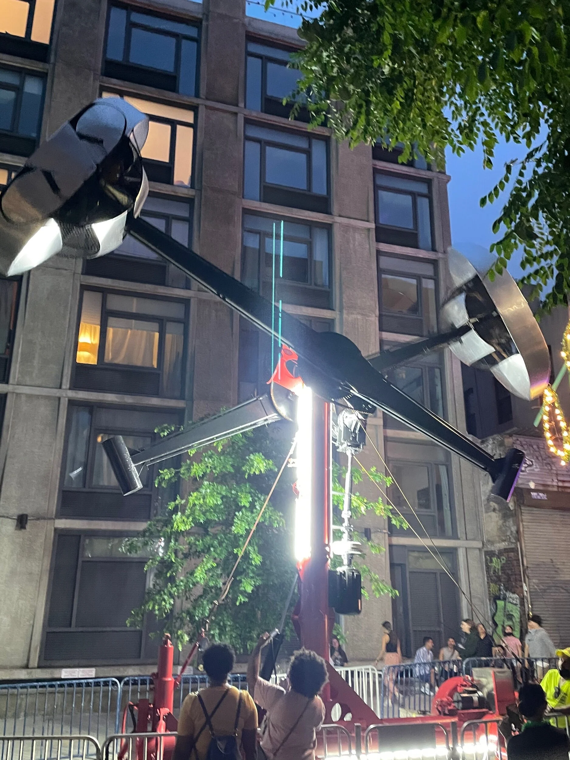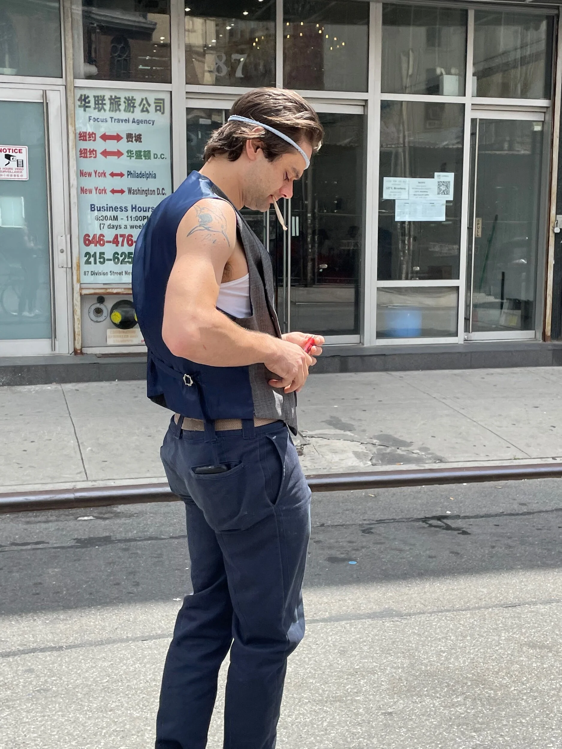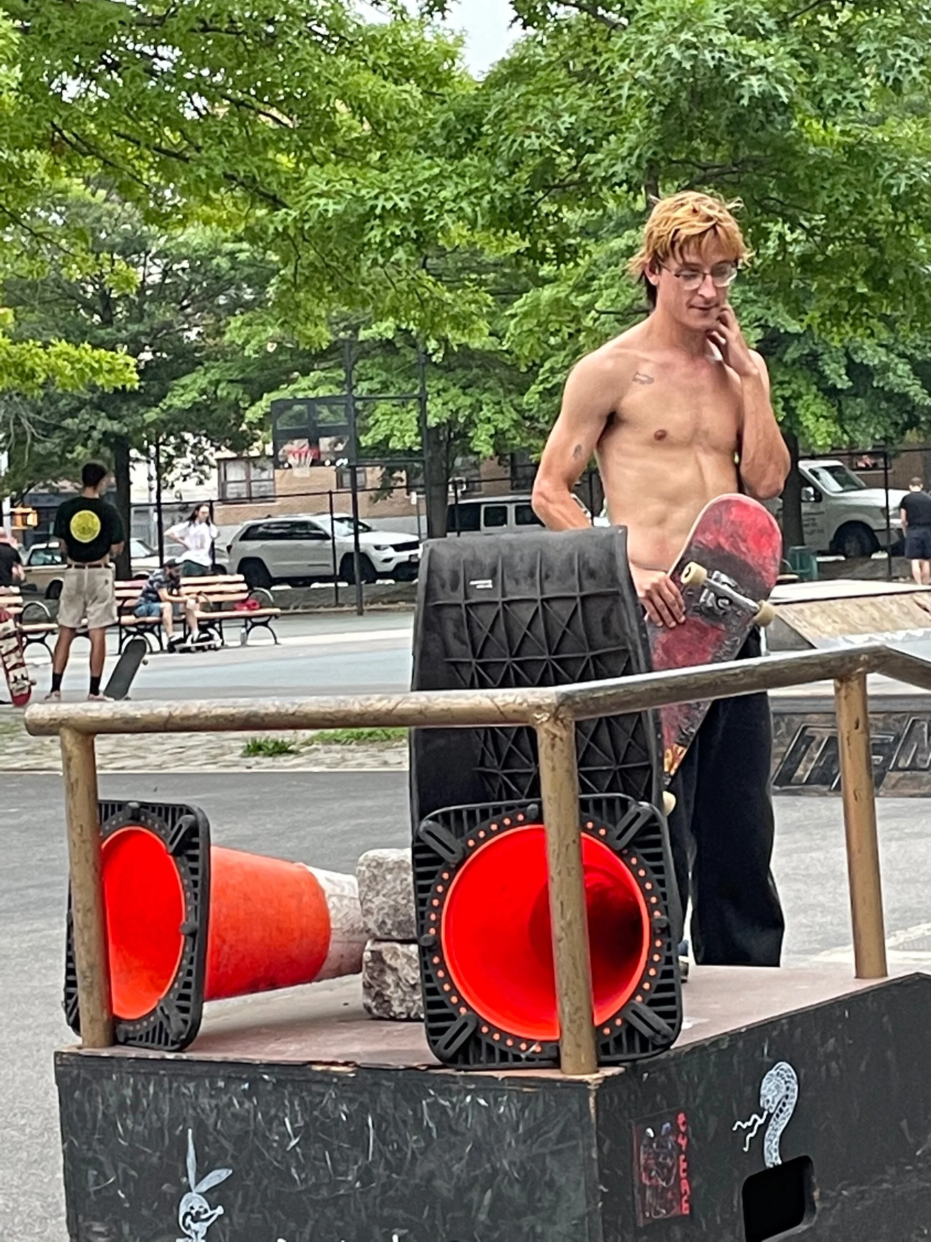 Max was cooking up an idea involving some sort of barrier and the Hasidic ledge. Ideally he thought the blue police barrier would work the best, but we found some white and orange shits in front of the studio available for the taking. He attached all the parts to his rig and brought them to the spot
