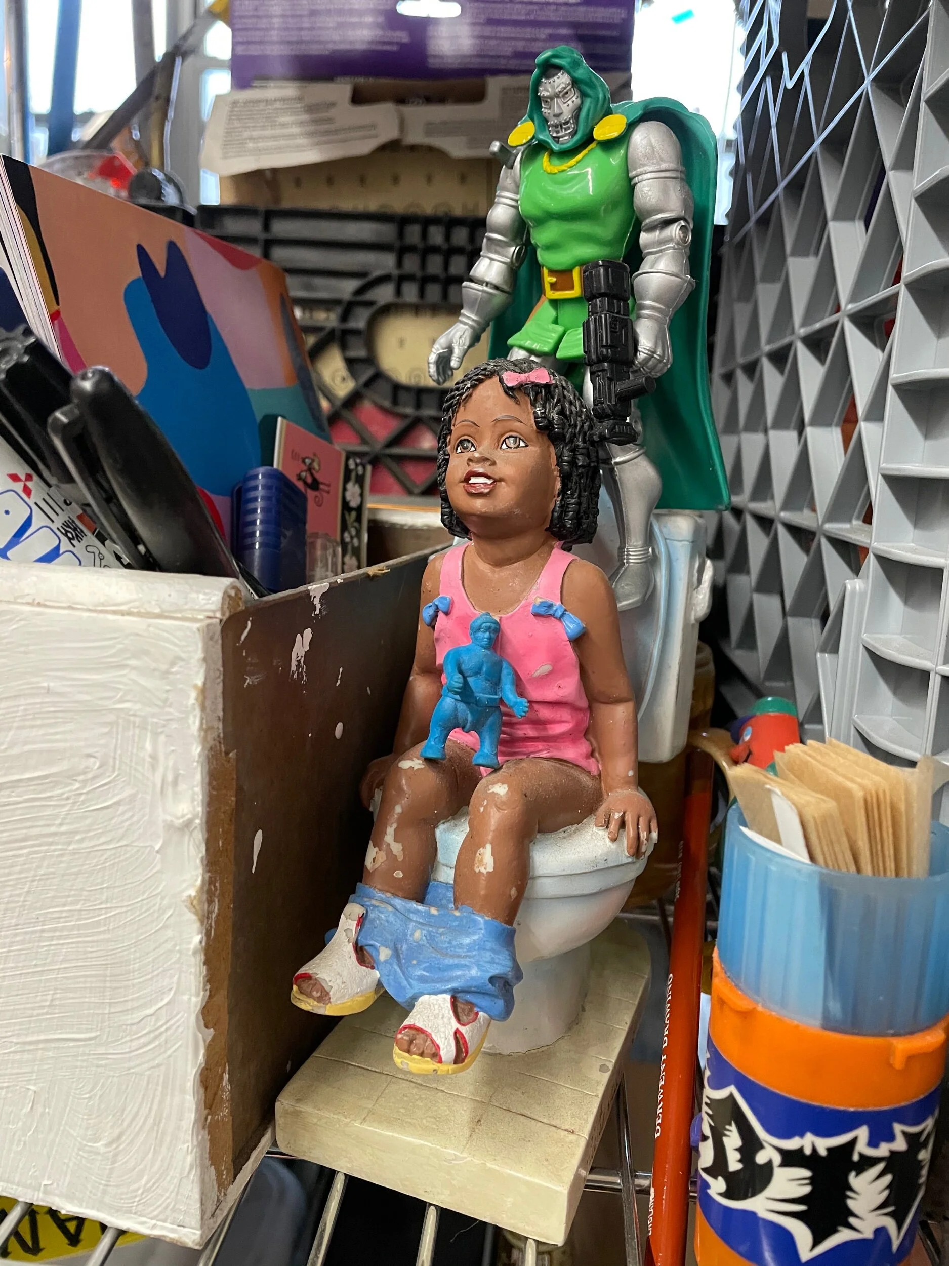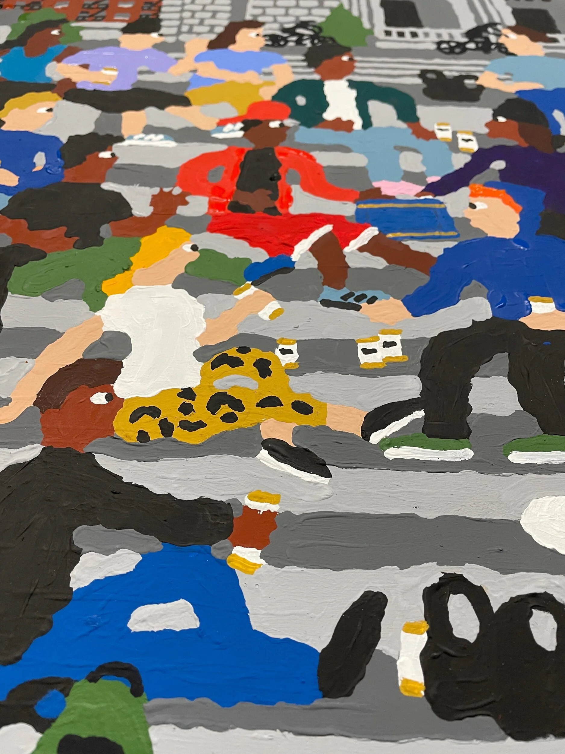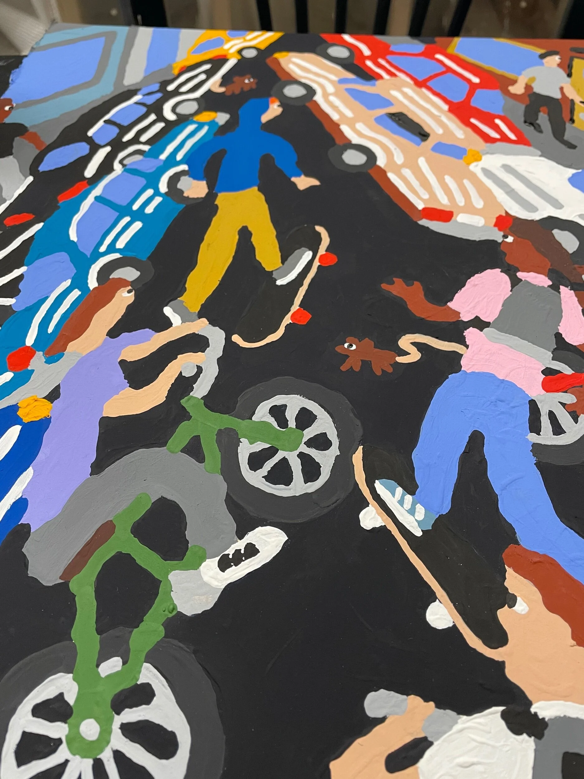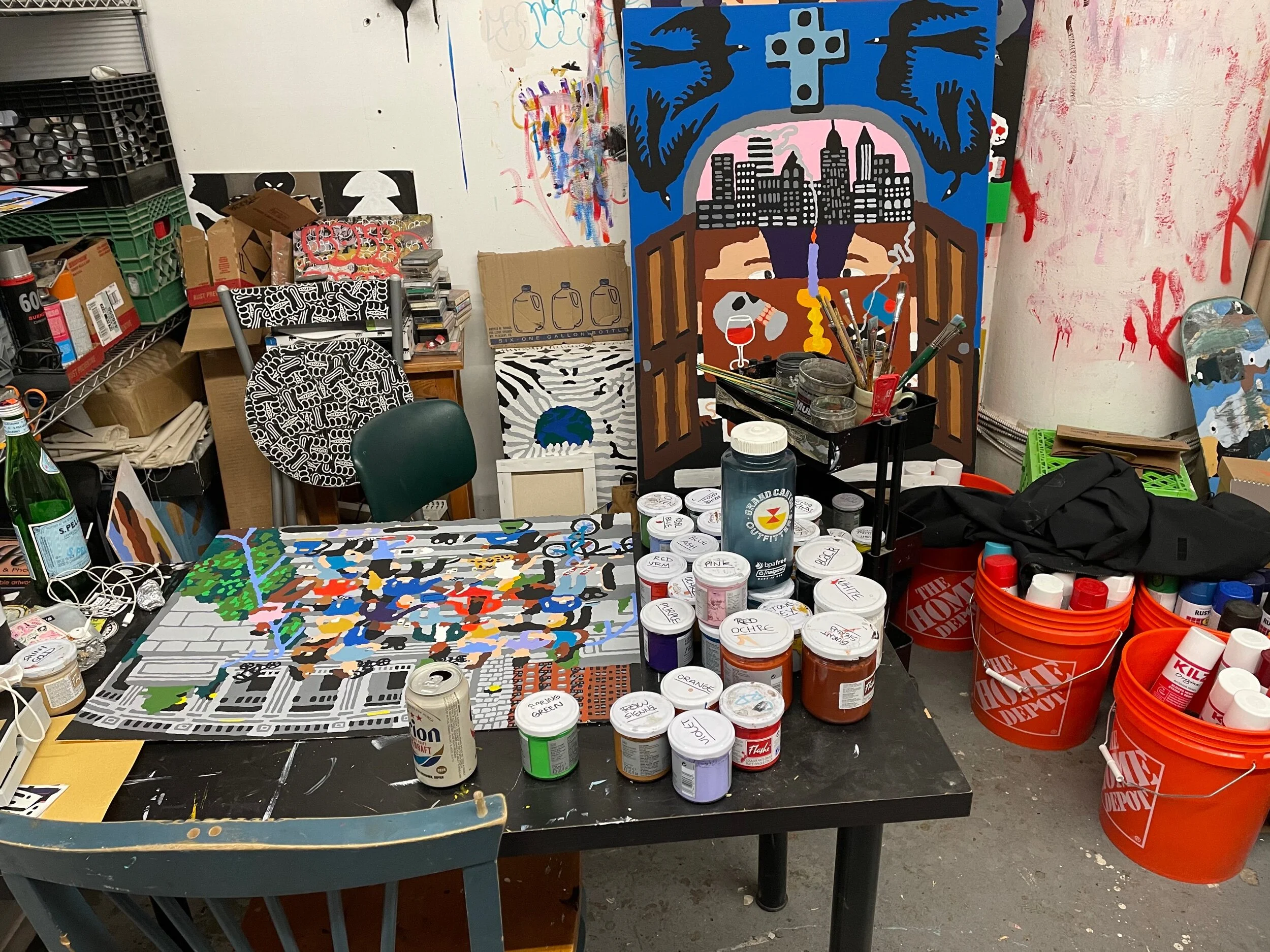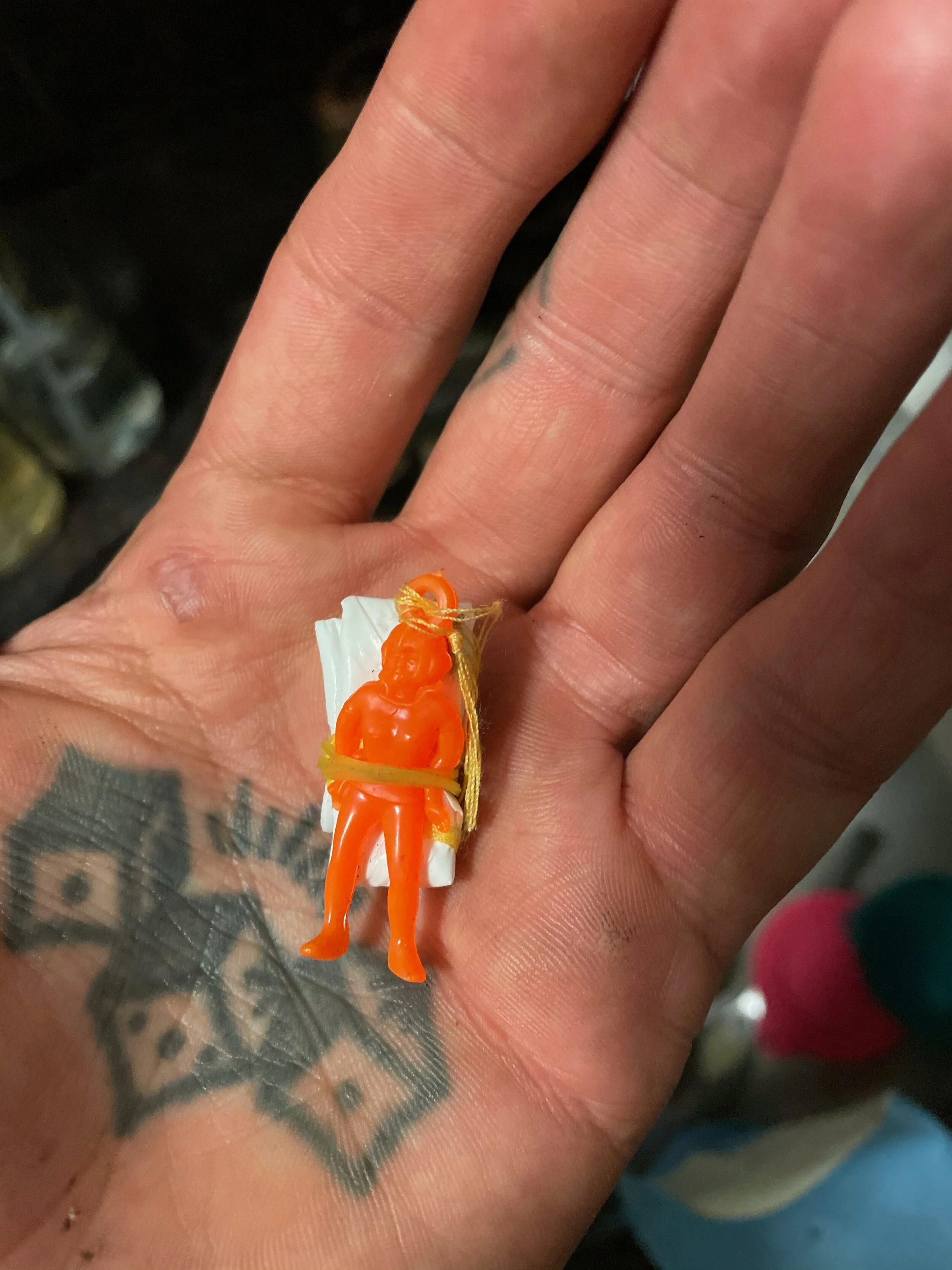 Max was cooking up an idea involving some sort of barrier and the Hasidic ledge. Ideally he thought the blue police barrier would work the best, but we found some white and orange shits in front of the studio available for the taking. He attached all the parts to his rig and brought them to the spot